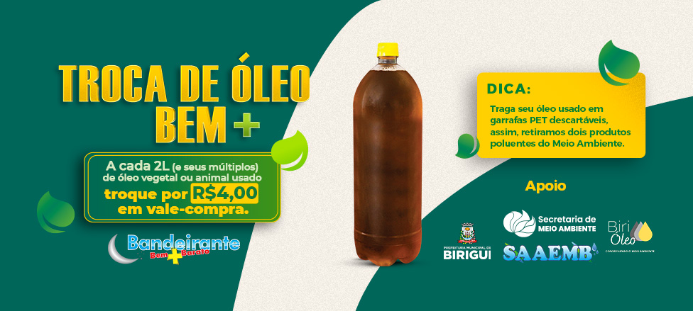 A conscientização é o primeiro passo para a preservação da natureza. Não sabe o que fazer com o óleo usado? É simples. Basta coar o óleo já utilizado na cozinha e despejar em uma garrafa pet. É importante armazenar em uma garrafa limpa e seca e após juntar 2 litros, ir até o Bandeirante Supermercados e trocar por seu vale-compra. O projeto atende a dois interesses: descarte correto do óleo usado e a retirada de garrafa pet da natureza.